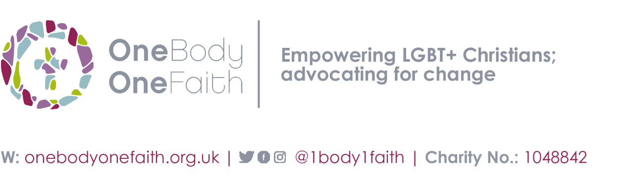 OneBodyOneFaith is a dynamic grassroots charity that enables LGBT+ Christians and advocates for change within the church, ecumenically and intentionally in partnership with like-minded organisations. For many LGBT+ Christians, places of Christian worship and community remain harmful and challenging; OneBodyOneFaith is committed to bringing about transformative change so that LGBT+ Christians can thrive, not just survive. Go to www.onebodyonefaith.org.uk for more information about their work and programmes.